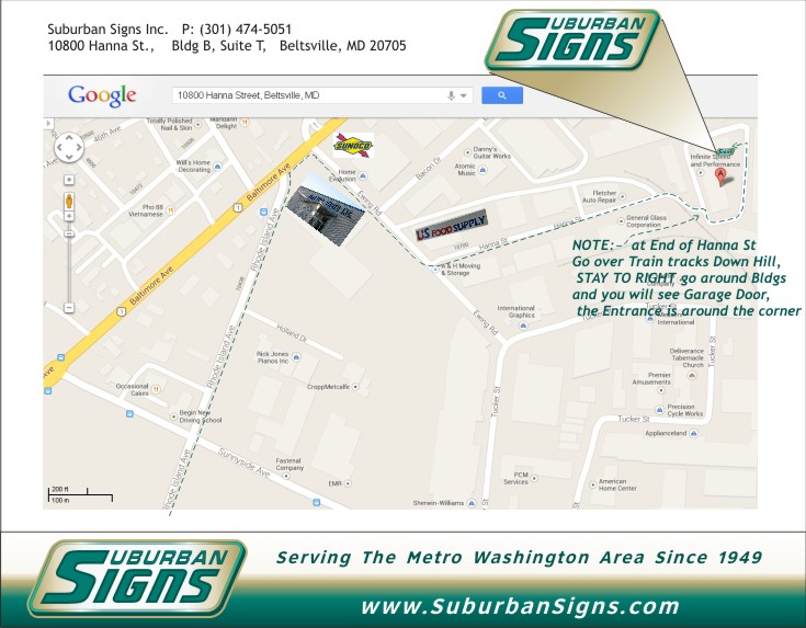 Suburban Signs Inc. 10800 Hanna St. Bldg B, Suite T Beltsville, MD 20705 P: (301) 474-5051 F: (301) 595-0017 joel@suburbansigns.com